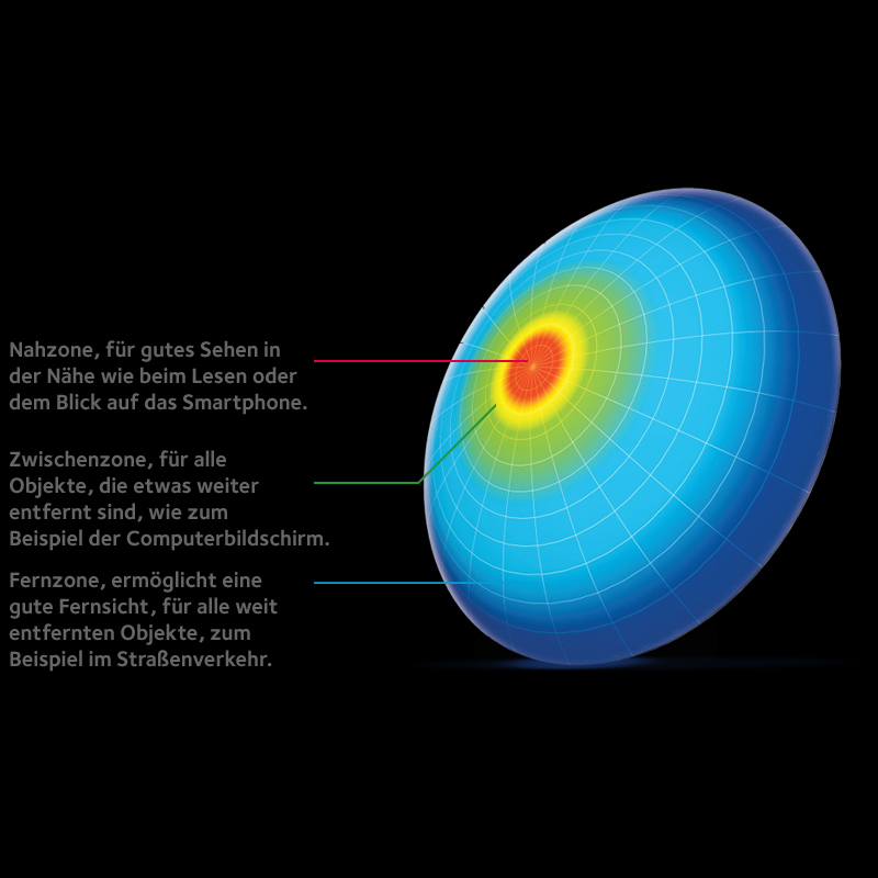 Gleitsichtkontaktlinsen haben mehrere unterschiedliche Zonen: eine für nahe Objekte, eine für die Fernsicht und eine für alles dazwischen. Je nachdem, was Sie gerade betrachten, nutzt Ihr Auge automatisch die dafür vorgesehene Zone der Kontaktlinse (nach einer gewissen Eingewöhnungszeit). Das Resultat: scharfes Sehen auf allen Distanzen.